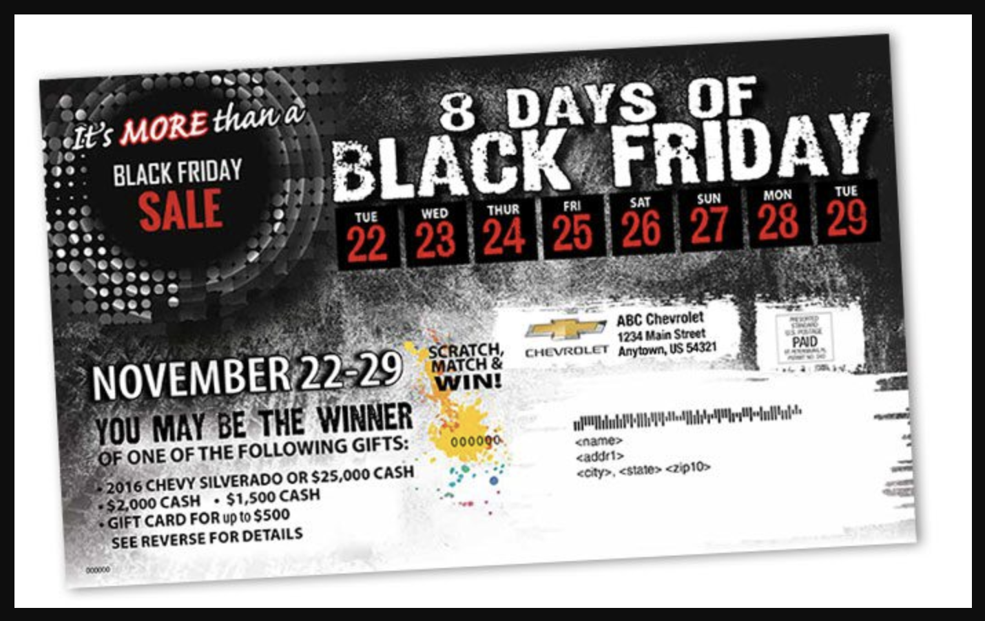 Be sure to send your mailers out a few days before Black Friday. If you send them the day of, people might be out shopping and will miss your message, and they might not take advantage of the deal if it’s a limited-time offer.