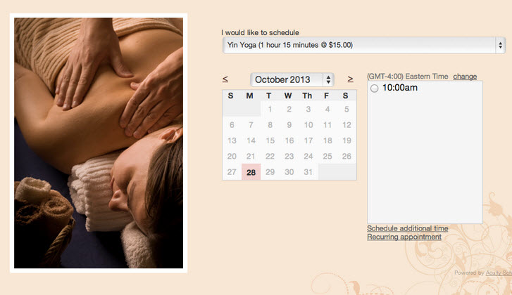 Displaying promotions or coupons on your calendar could help you fill slow days. Genbook and Schedulicity will manage a “buy now” offer program for you, handling the payments for a small cut. Acuity Scheduling integrates with voucher codes or group booking discounts from Groupon, Amazon Local and Facebook.